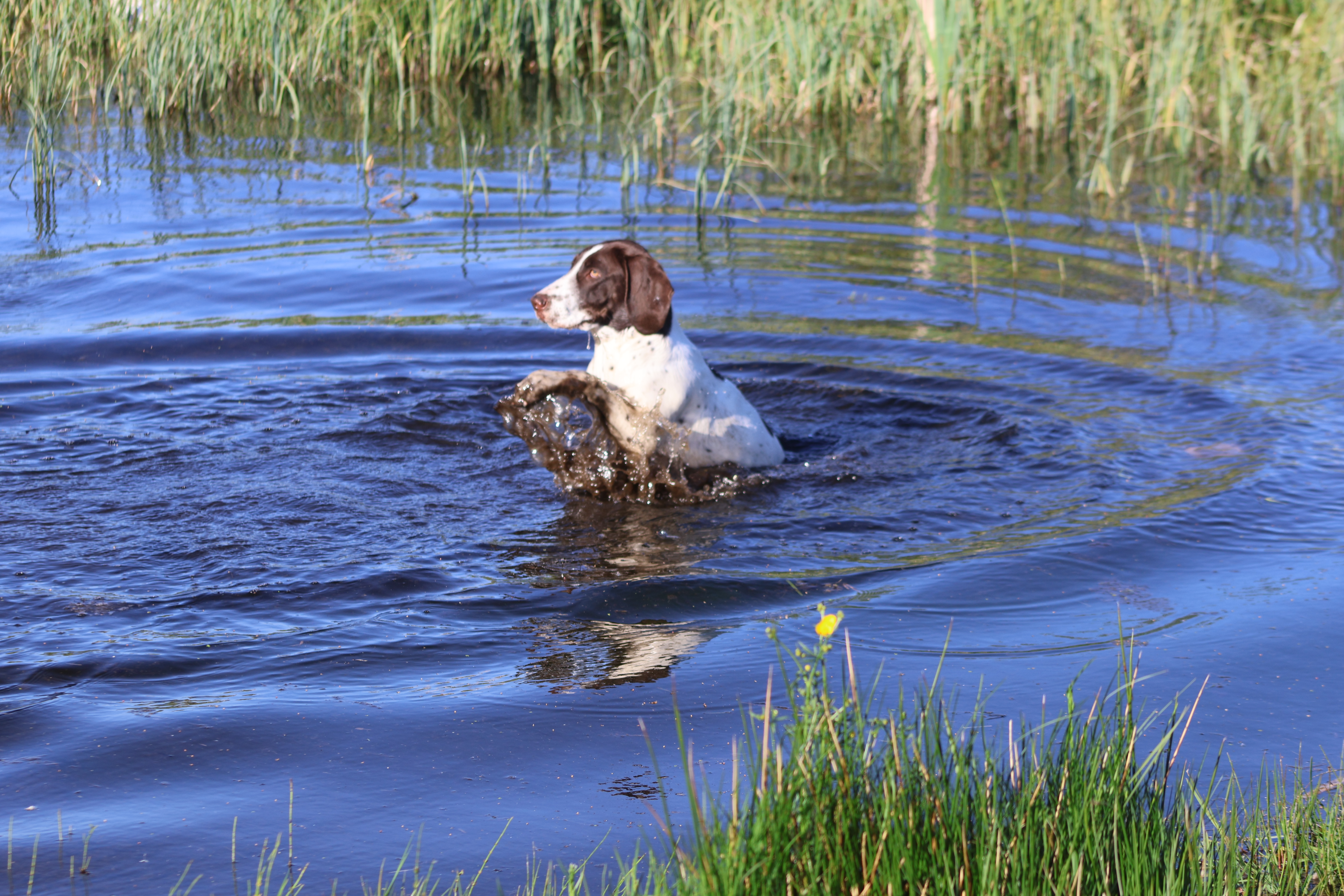 Vores hundehvalp, Aastrupgaard Soya, som nu er 6 måneder gammel har været med i søen for første gang siden vinterbadning i de store vandpytter, og hun er helt vild med vand!